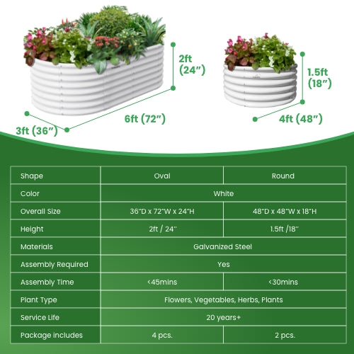 Set of 6: 2pcs(4x1.5ft) & 4 pcs (6x3x2ft) Metal Raised Garden Bed (White)